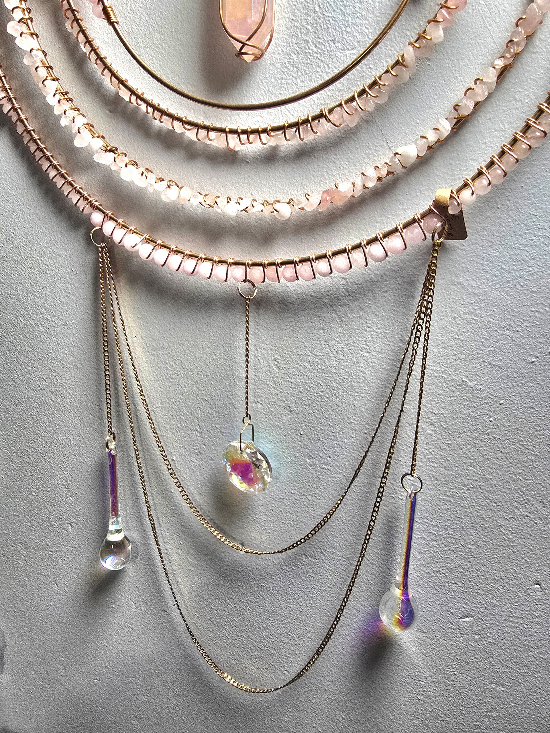 Wrapped in rose quartz and copper wire. The centre holds an aura coated rose quartz tower adding to the princess vibe. Below hangs one aura coated prism with a glass droplet either side.